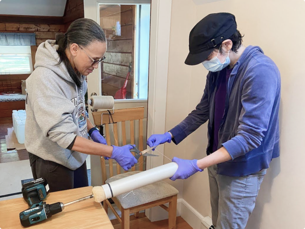 When wrapping your spools, we suggest tying a 2” piece of seed string in the middle of the spool. This tail will be helpful for snipping small pieces off of to observe with the microscope as the kelp starts to grow. We’ll outline this process in more detail in the Monitoring Growth course. It may also be helpful to tie a bowline or other loop knot at the end of your seedstring so you can use it to pull on when you are seeding in the field.